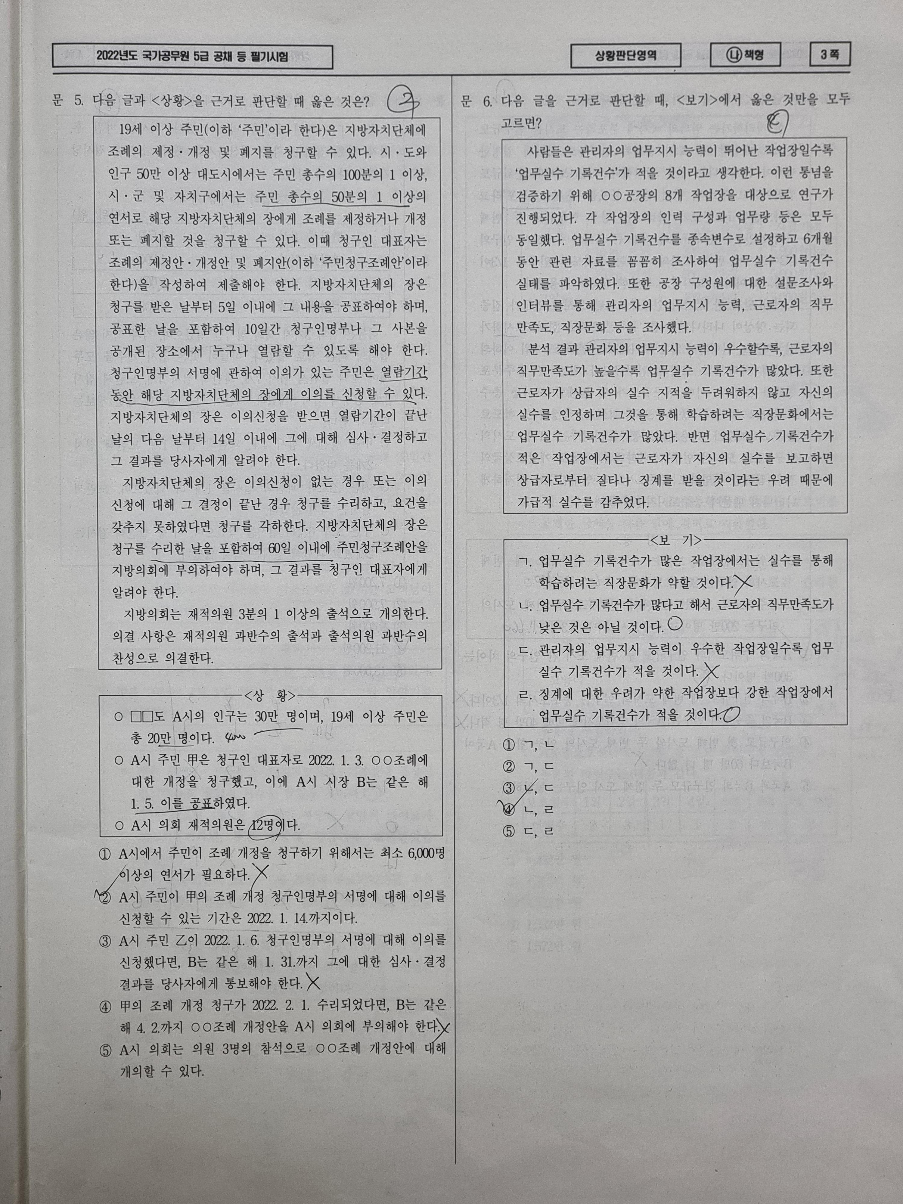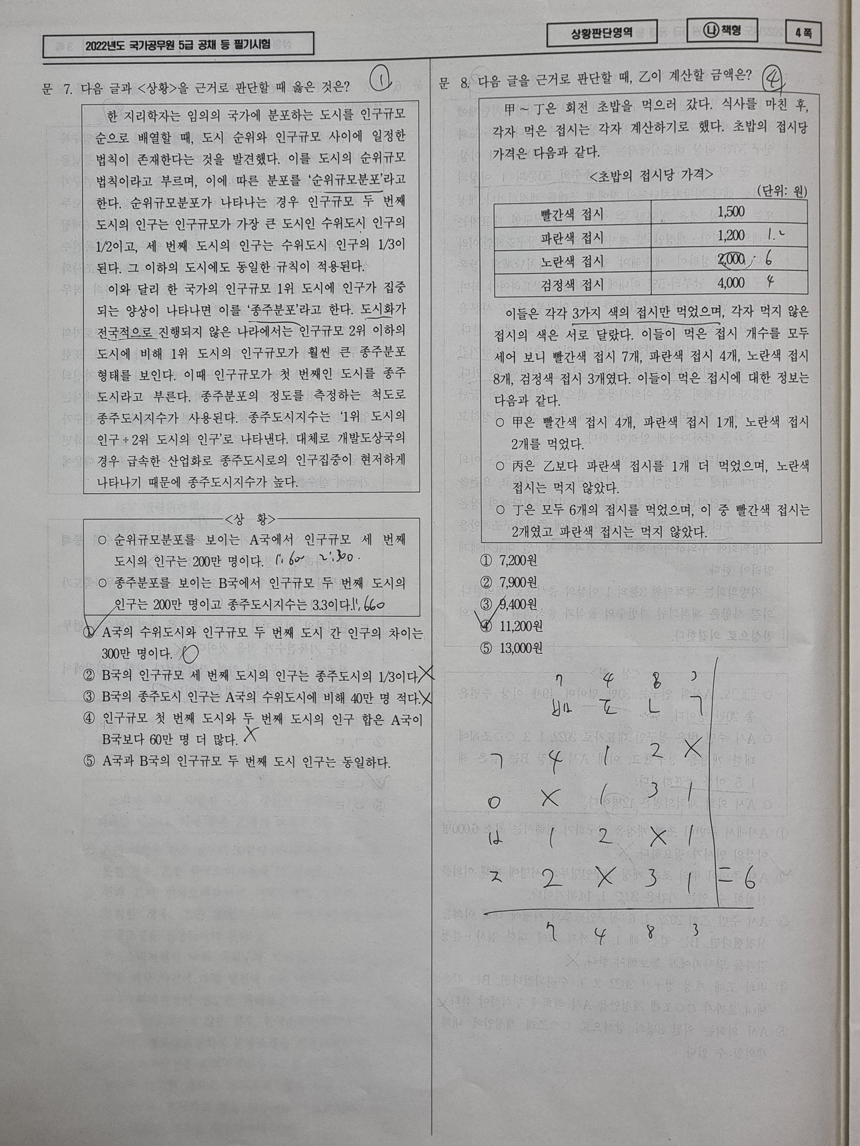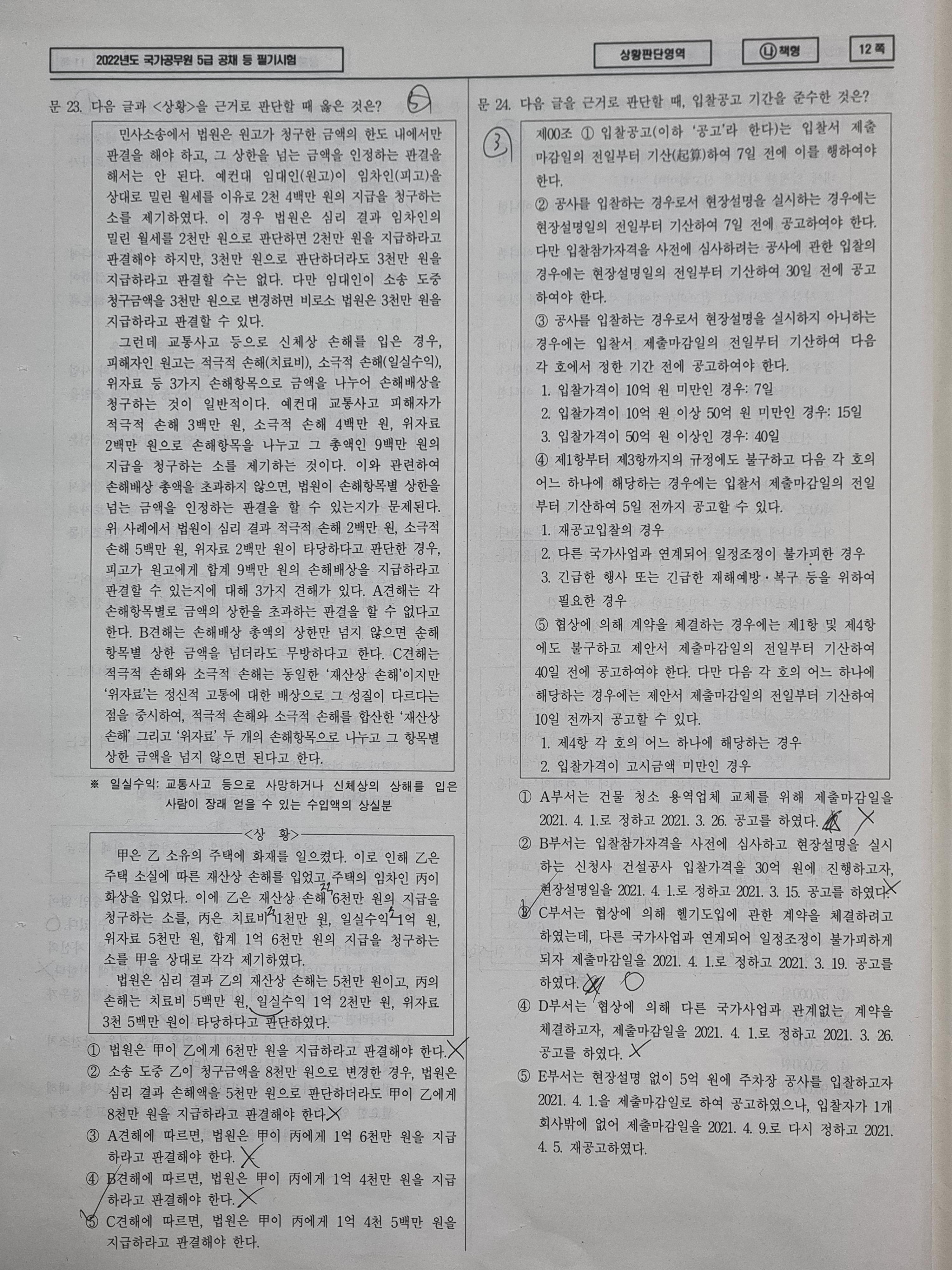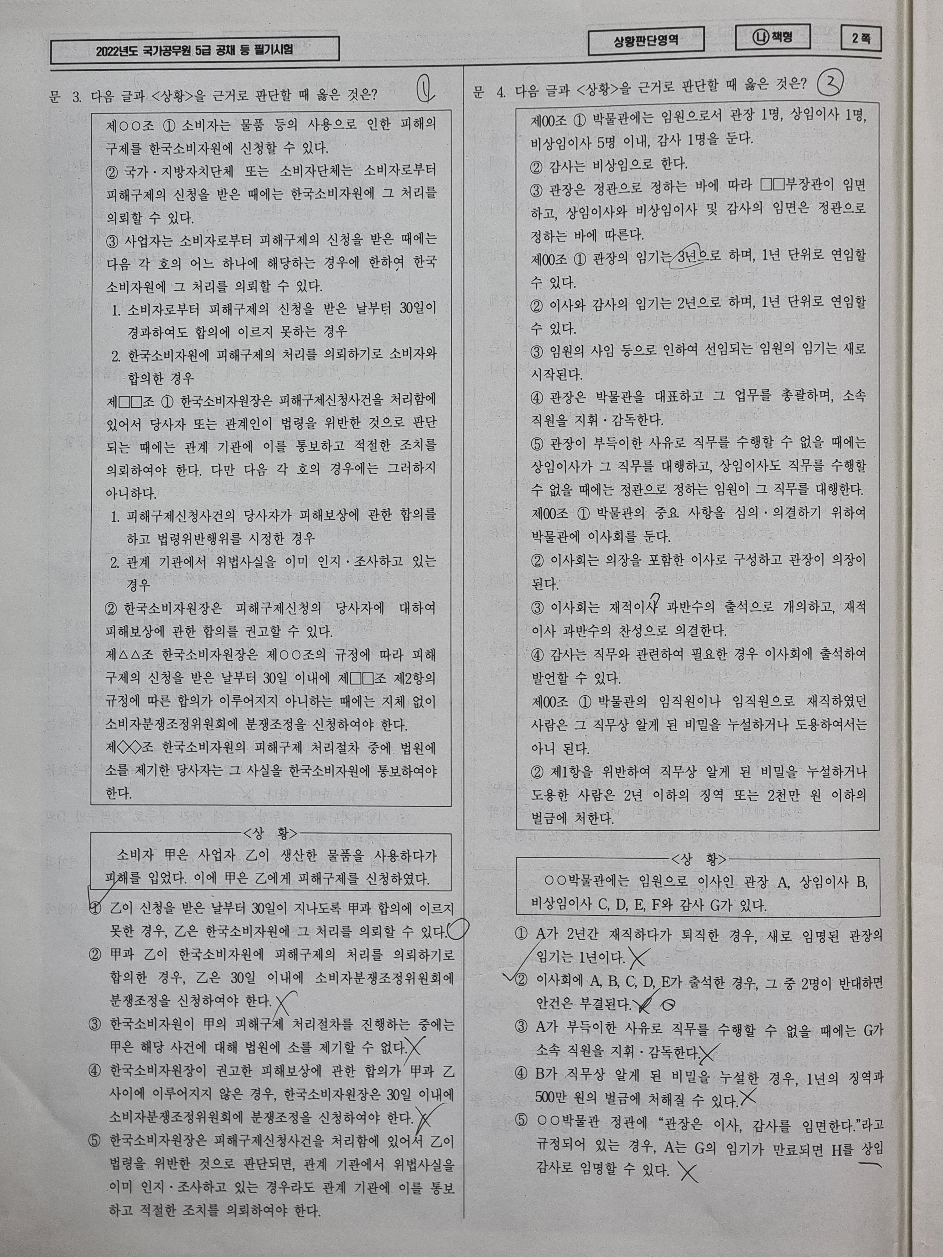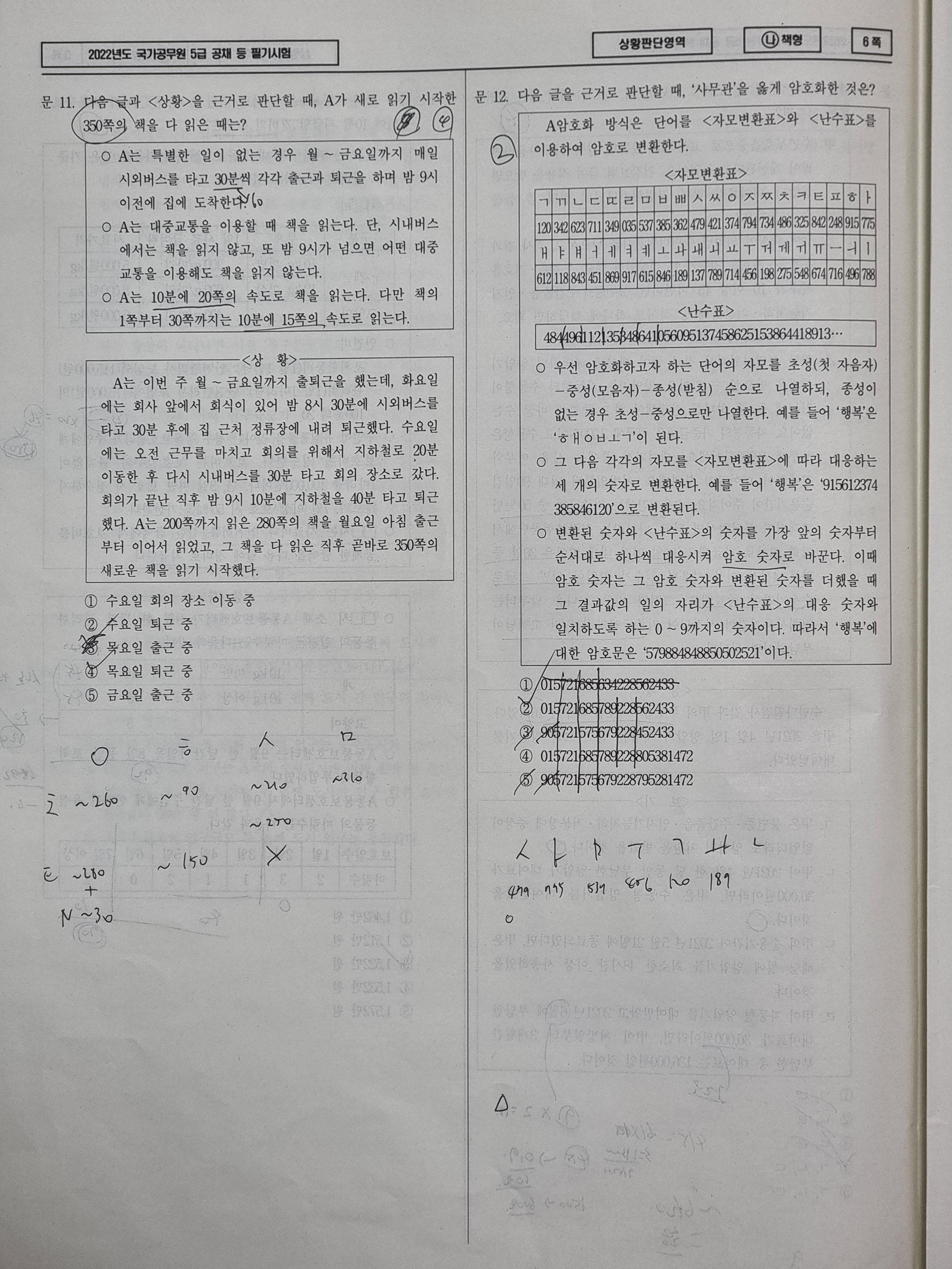 2022년 5급 PSAT 상황판단 풀이문제지 풀이 기록 2022. 2. 27. 2022년 5급 PSAT 상황판단 풀이문제지다. 2022년 5급 PSAT 실전 복기·후기 (가채점 83.3) 소리소문없이(?) 2022년 5급 PSAT 시험장에 다녀왔다. 어차피 붙으려고 보는 건 아니니 시험장이 집과 가장 가까울 것으로 예상되는 외교원후보자선발시험에 원서접수했고, 예상대로 집과 가장 가 psat-bamdori.tistory.com 공유하기 게시글 관리 PSAT 푸는 밤도리 저작자표시 비영리 변경금지 (새창열림) '풀이 기록' 관련 글 더보기 2022년 7급·민경채 PSAT 상황판단 풀이문제지 2022.07.23 더 읽기 2022년 7급·민경채 PSAT 언어논리 풀이문제지 2022.07.23 더 읽기 2022년 5급 PSAT 자료해석 풀이문제지 2022.02.27 더 읽기 2022년 5급 PSAT 언어논리 풀이문제지 2022.02.27 더 읽기 댓글