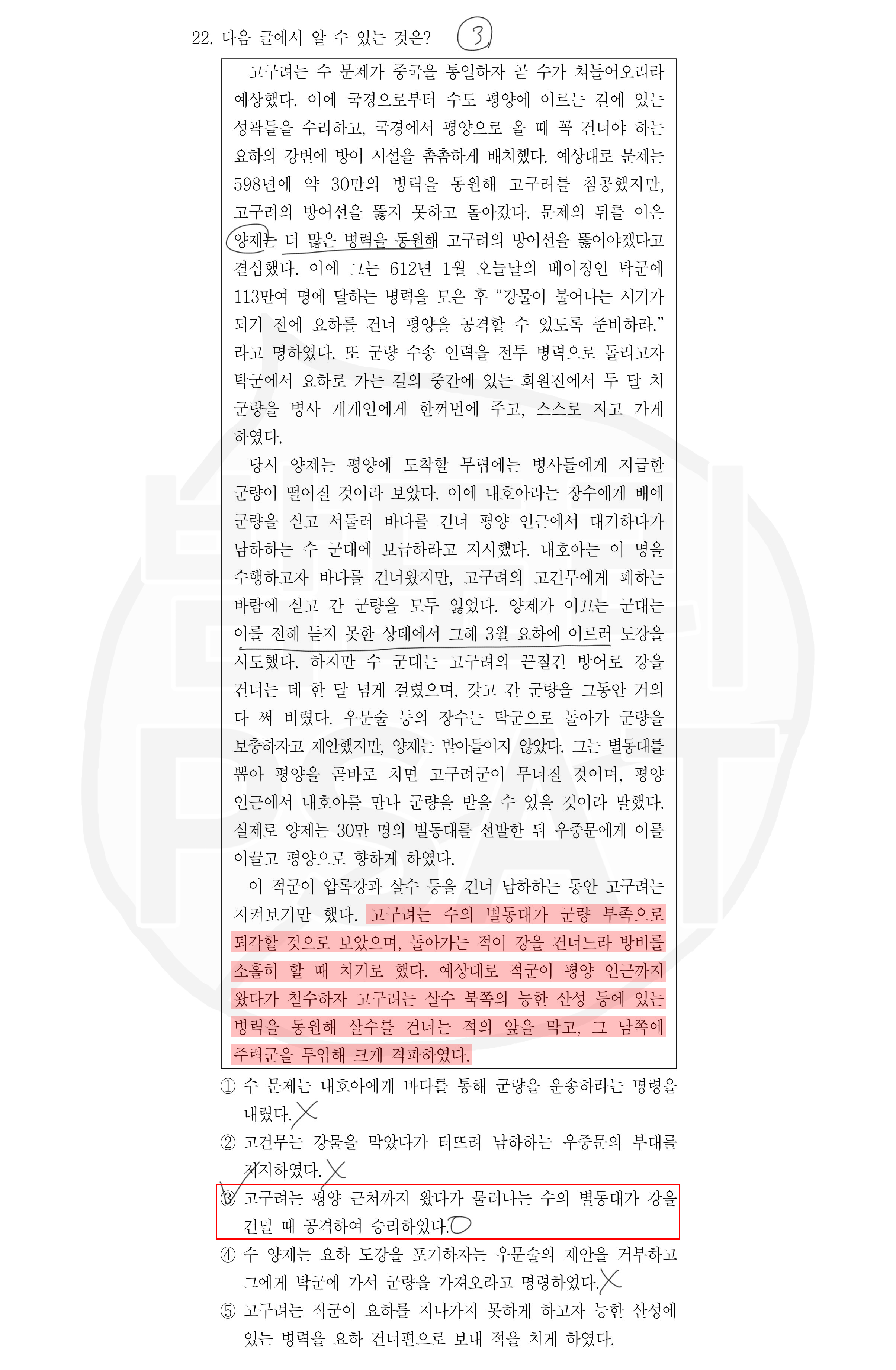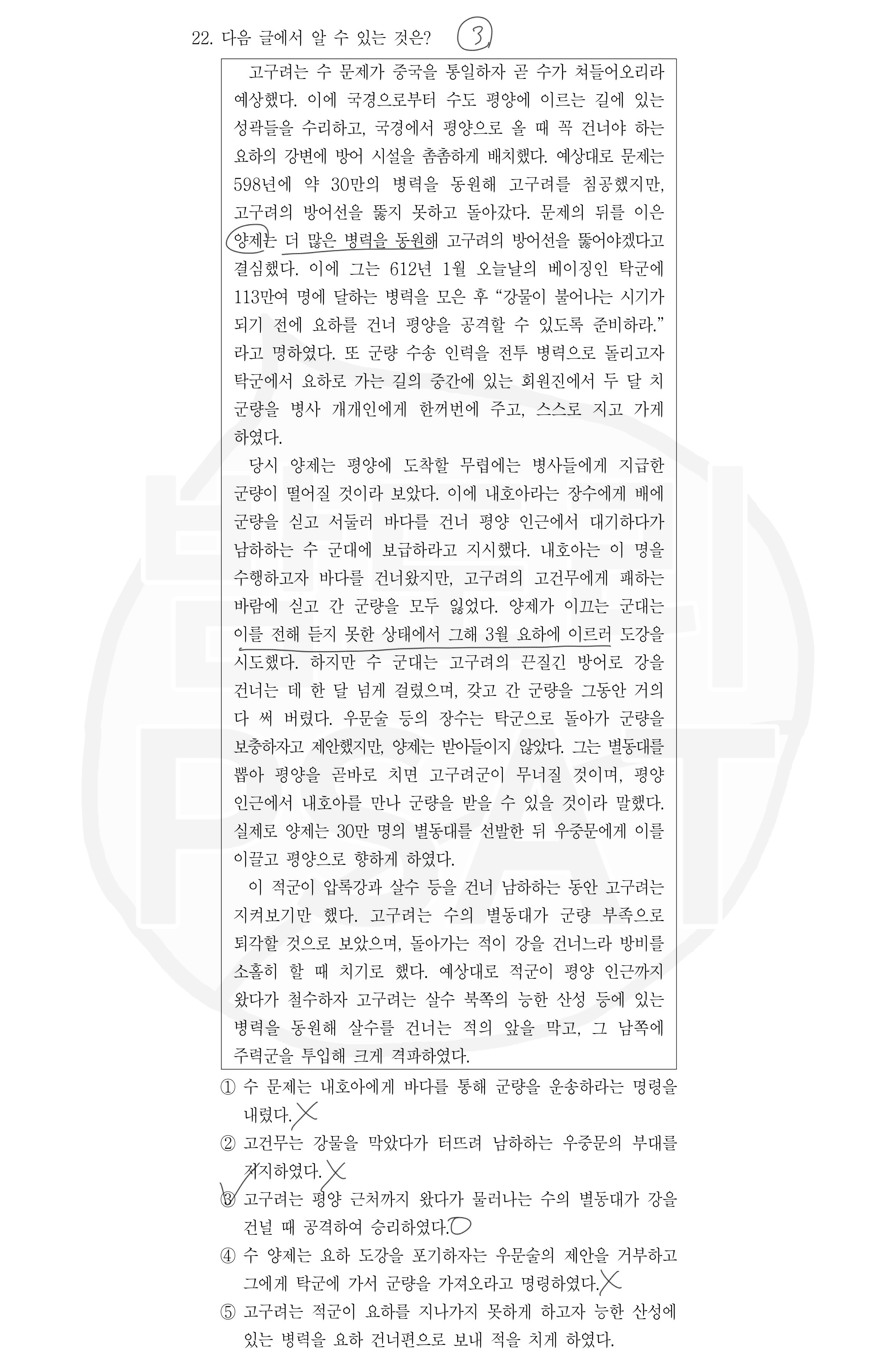 ⑤ 고구려는 적군이 요하를 지나가지 못하게 하고자 능한 산성에 있는 병력을 요하 건너편으로 보내 적을 치게 하였다.