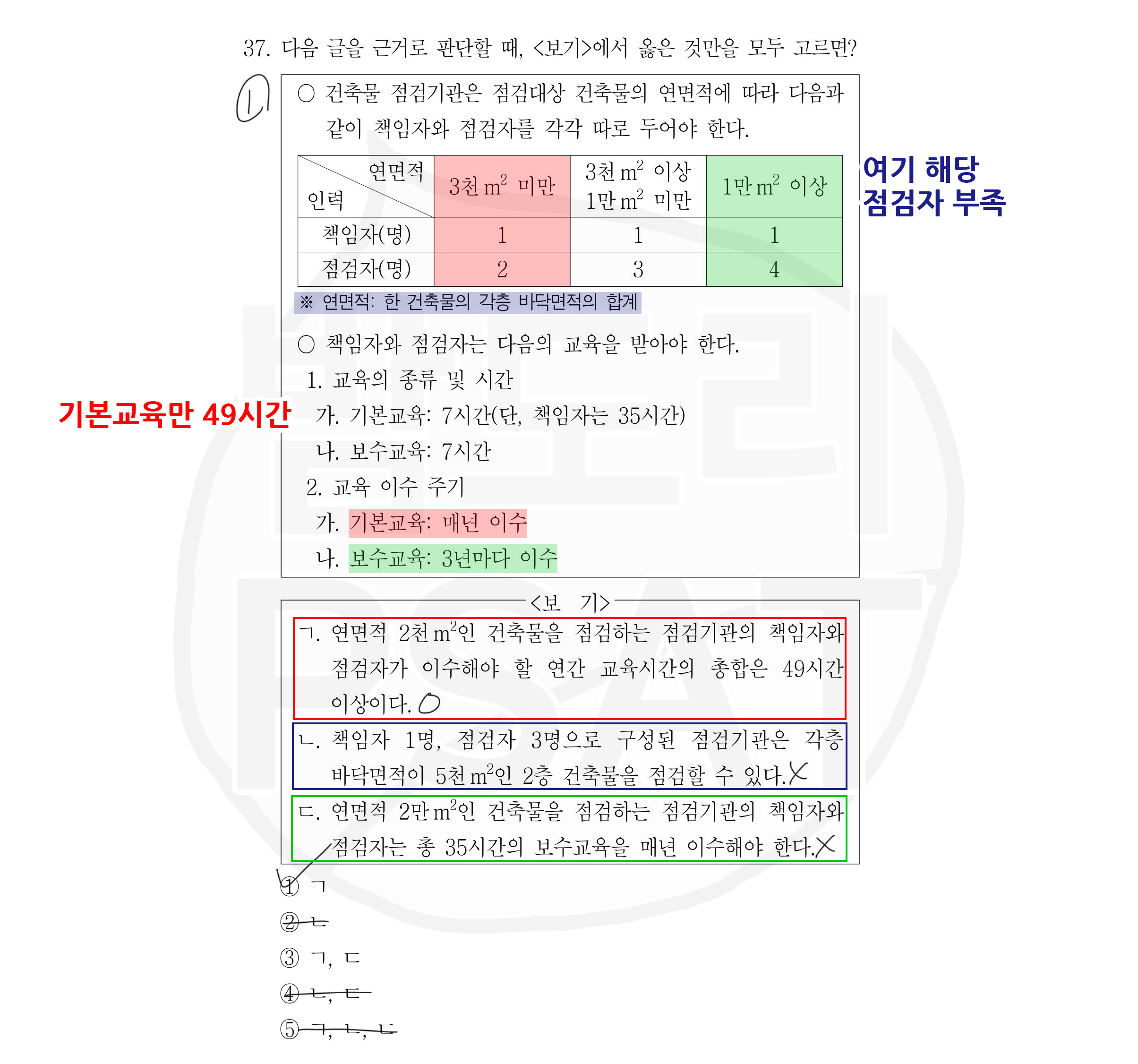 ㄷ. 연면적 2만m2인 건축물을 점검하는 점검기관의 책임자와 점검자는 총 35시간의 보수교육을 매년 이수해야 한다. (X)