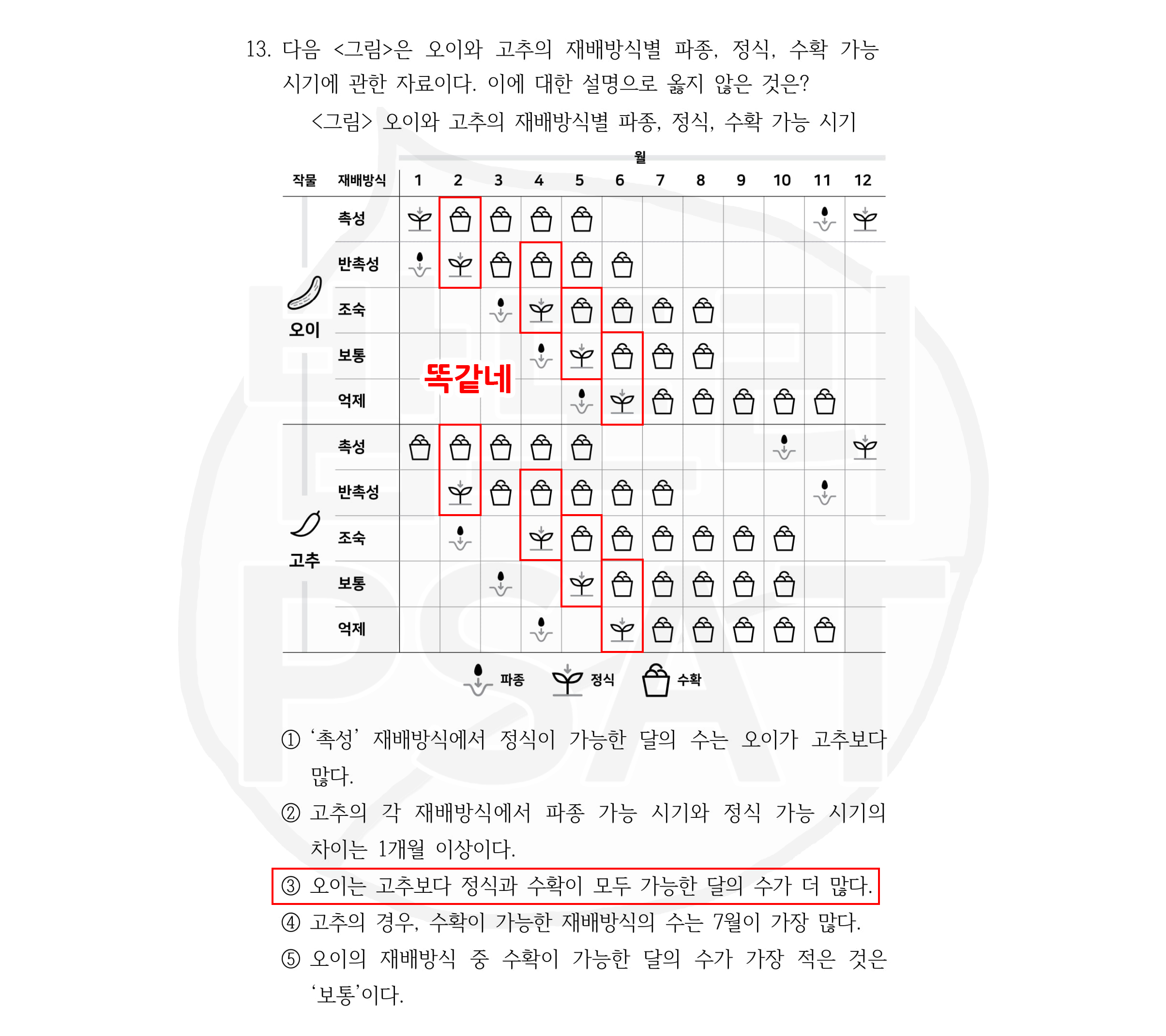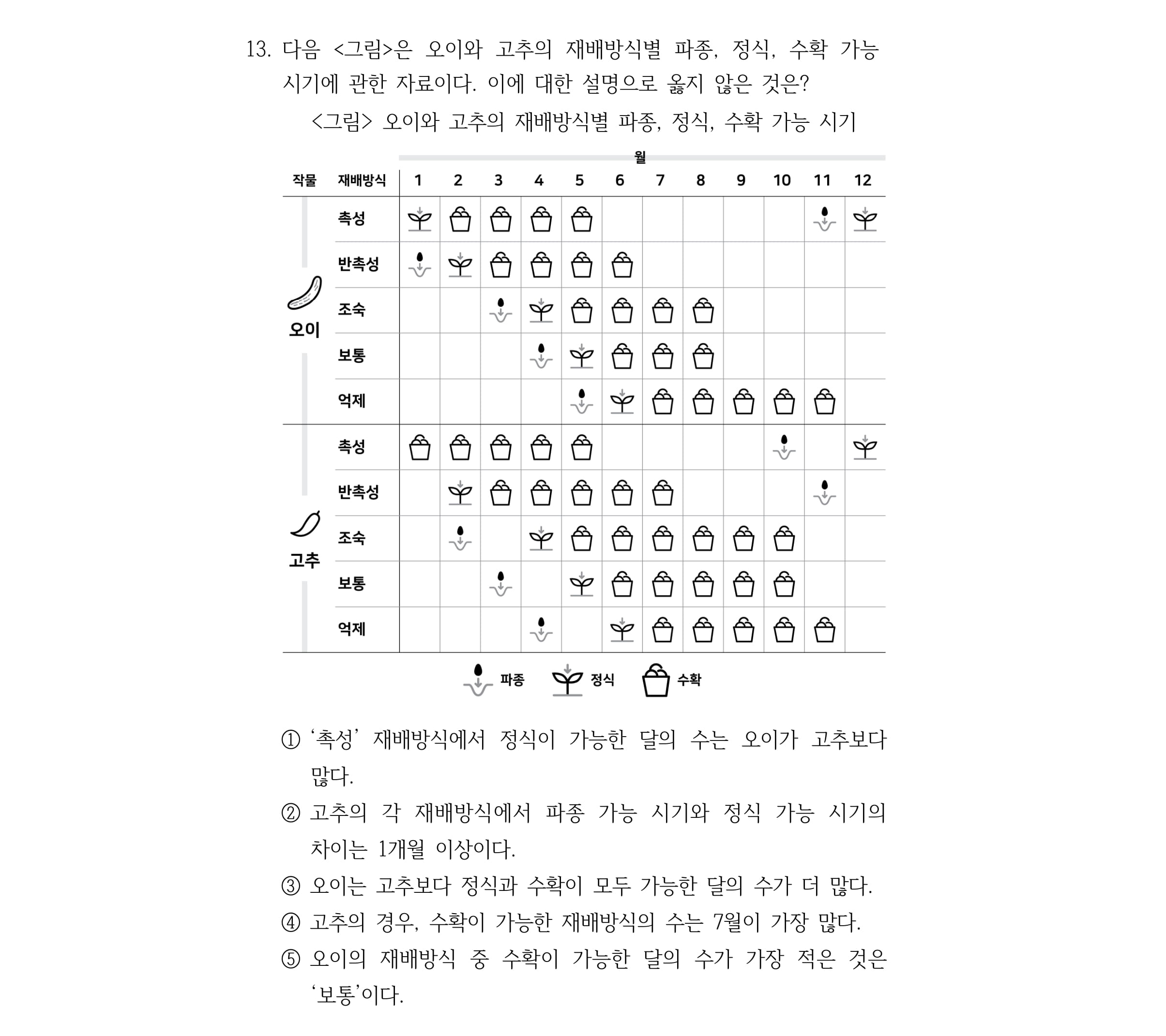 위아래에서 각각 계수하는 간단한 선지다. 정식이 가능한 달이 거의 같아서 비교가 쉽다. 오이와 고추 모두 2, 4, 5, 6월에 둘 다 가능하니 틀린 내용.